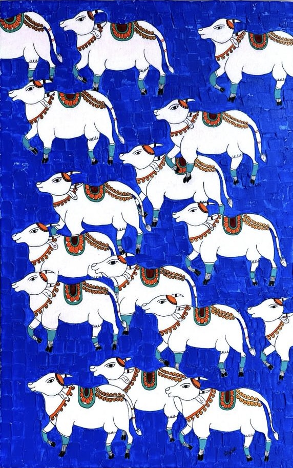 Pichwai is a traditional Indian art form, originating in Nathdwara, Rajasthan, featuring large, intricate cloth paintings .The name comes from Sanskrit "pichh" (back) and "wai" (hanging), and these devotional artworks, rich in natural colors, elaborate details like Cows, lotus.This art has evolved from sacred temple art to popular home decor, celebrated for their vibrant themes and cultural significance.